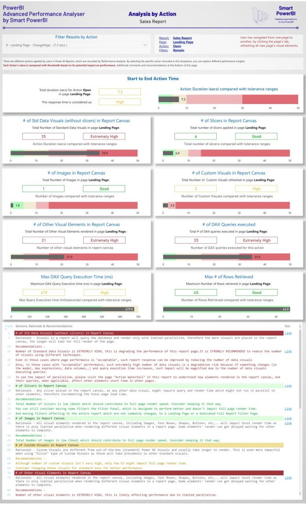 The use of “Advanced Performance Analyzer by SmartPowerBI” returns a full and clear report showing all performance affecting factors, recommendations specific to the magnitude of those factors and links to best practices and guidelines associated to such recommendations.