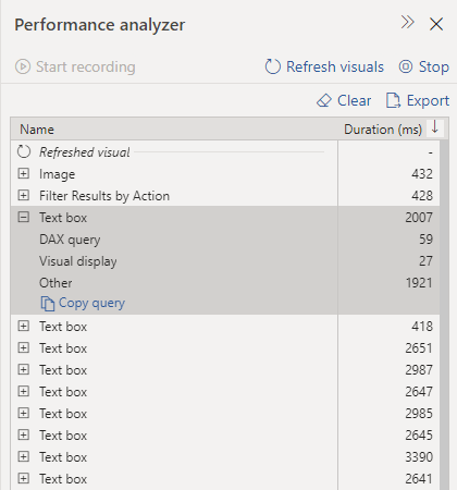 During a Power BI Desktop Performance Analyzer session, we can record several actions and the time taken for all the visual elements rendered within each action. The most common action recorded will be “page refresh”, which we will do by changing tabs, however we can also record actions such as drill down, change filter selection, or highlight a data point.